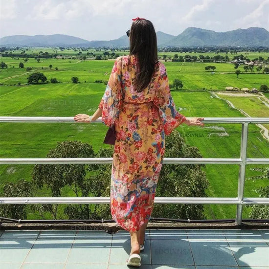 Apportez une touche de fraîcheur avec ce kimono plage fleuri femme, au tissu léger, parfait pour les vacances d'été, la détente au soleil ou une promenade stylée.
