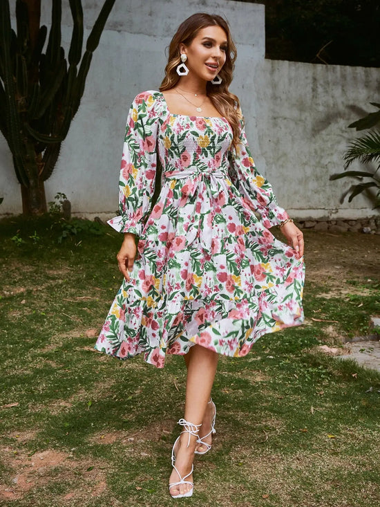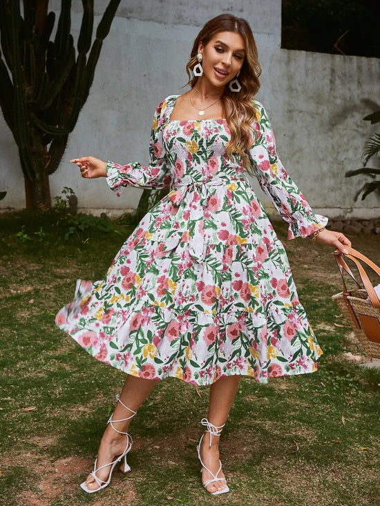 Craquez pour cette robe chic et fleurie au col carré élégant, idéale pour sublimer votre silhouette avec une ceinture assortie et une coupe fluide irrésistible.