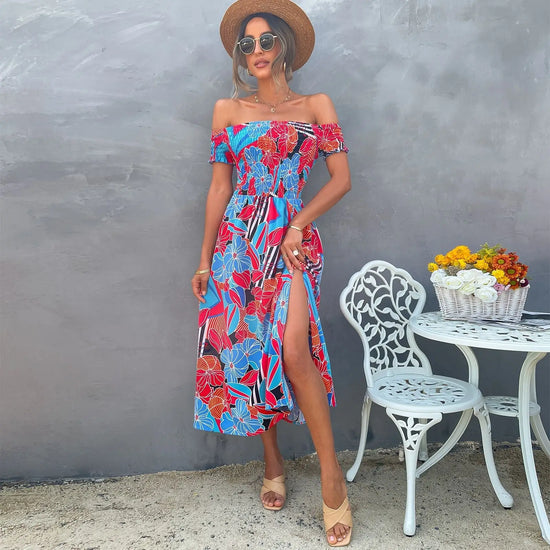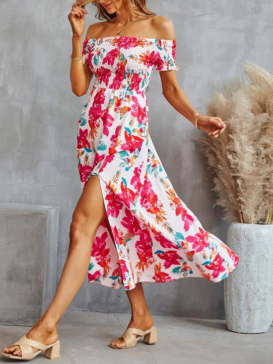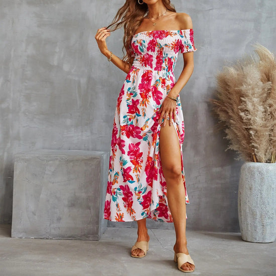 Dévoilez votre élégance naturelle avec cette robe bohème chic, fluide et sensuelle. Son col bateau met vos épaules en valeur, tandis que sa coupe fendue sublime la silhouette.