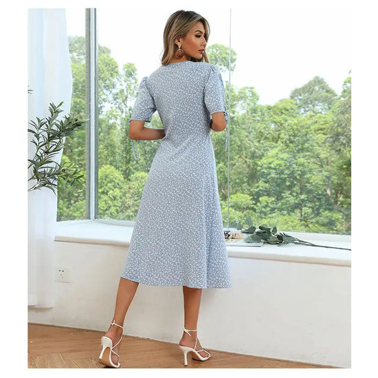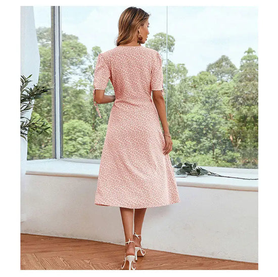 Robe fluide au col en V élégant, soulignant la silhouette avec finesse. Ses volants délicats et motifs fleuris ajoutent une touche bohème irrésistible à votre garde-robe féminine.